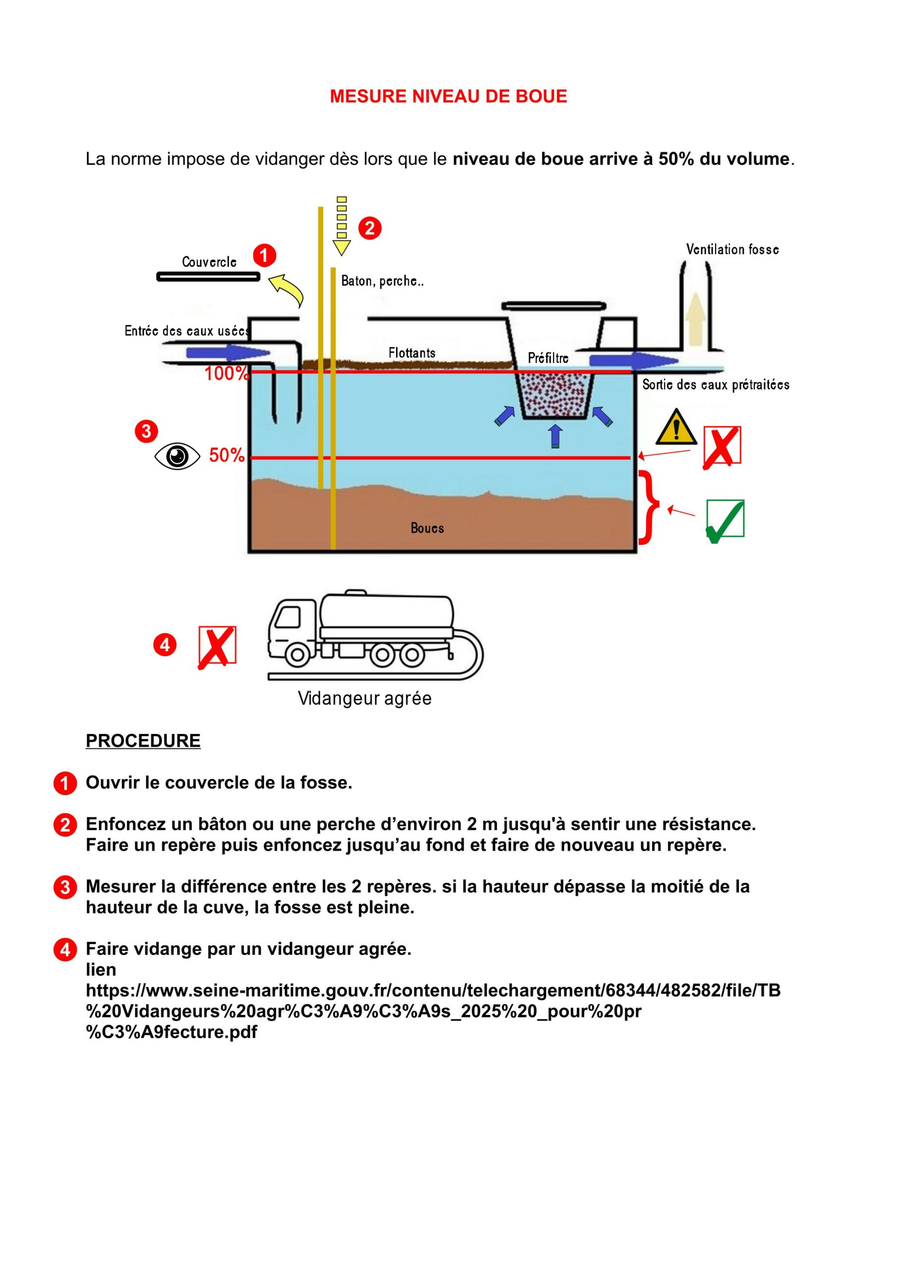 - Vidange lorsque les boues atteignent 50 % du volume total de la fosse (Cette vidange doit être réalisée par une entreprise agréée par le préfet et les matières de vidange doivent être retraitées)
